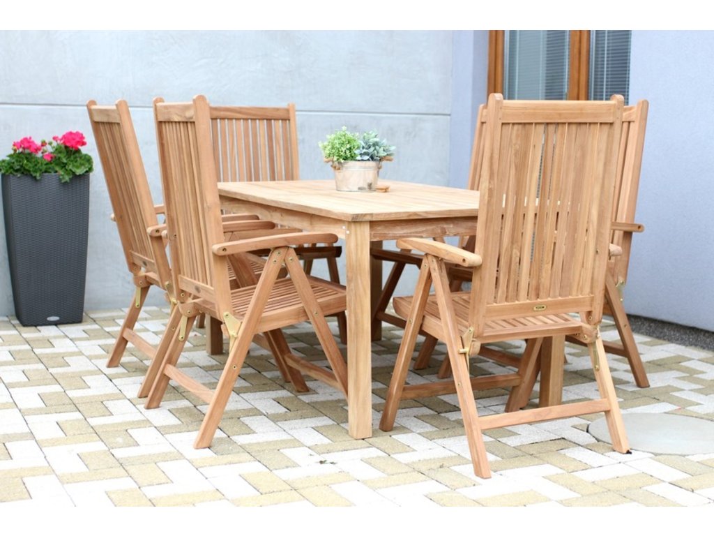 Zahradní sestava nábytku z teaku z řady Garden. Kvalita exotické dřeviny teak je ověřená. Pokud tedy chcete luxusní zahradní nábytek, pak je teak to správné řešení. Vysoká odolnost proti povětrnostním vlivům, vysoká tvrdost dřeva a nádherná kresba. Sestava je dodávána v přírodním provedení teak natural. Z řady Garden je i sestava zahradního nábytku Garden I. Hranatý teakový robustní stůl s otvorem pro slunečník a 6 polohovacích a skládacích židlí Edy tvoří dohromady opravdu luxusní sestavu nábytku pro Vaši zahradu.