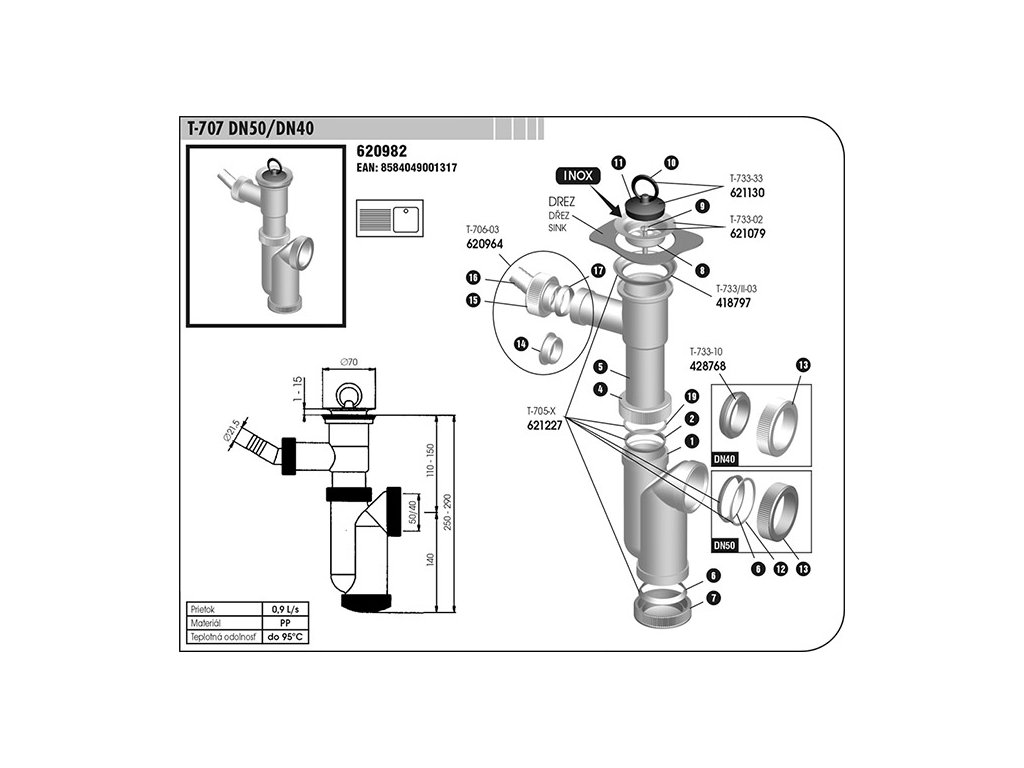Sifon dřezový DN 40/50 s přípojkou nerez mřížka 70mm T 707. Tepelná odolnost do 95°C. Materiál: nerez a polypropylen. Průtok činí 0,9 l/s.